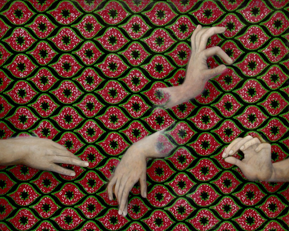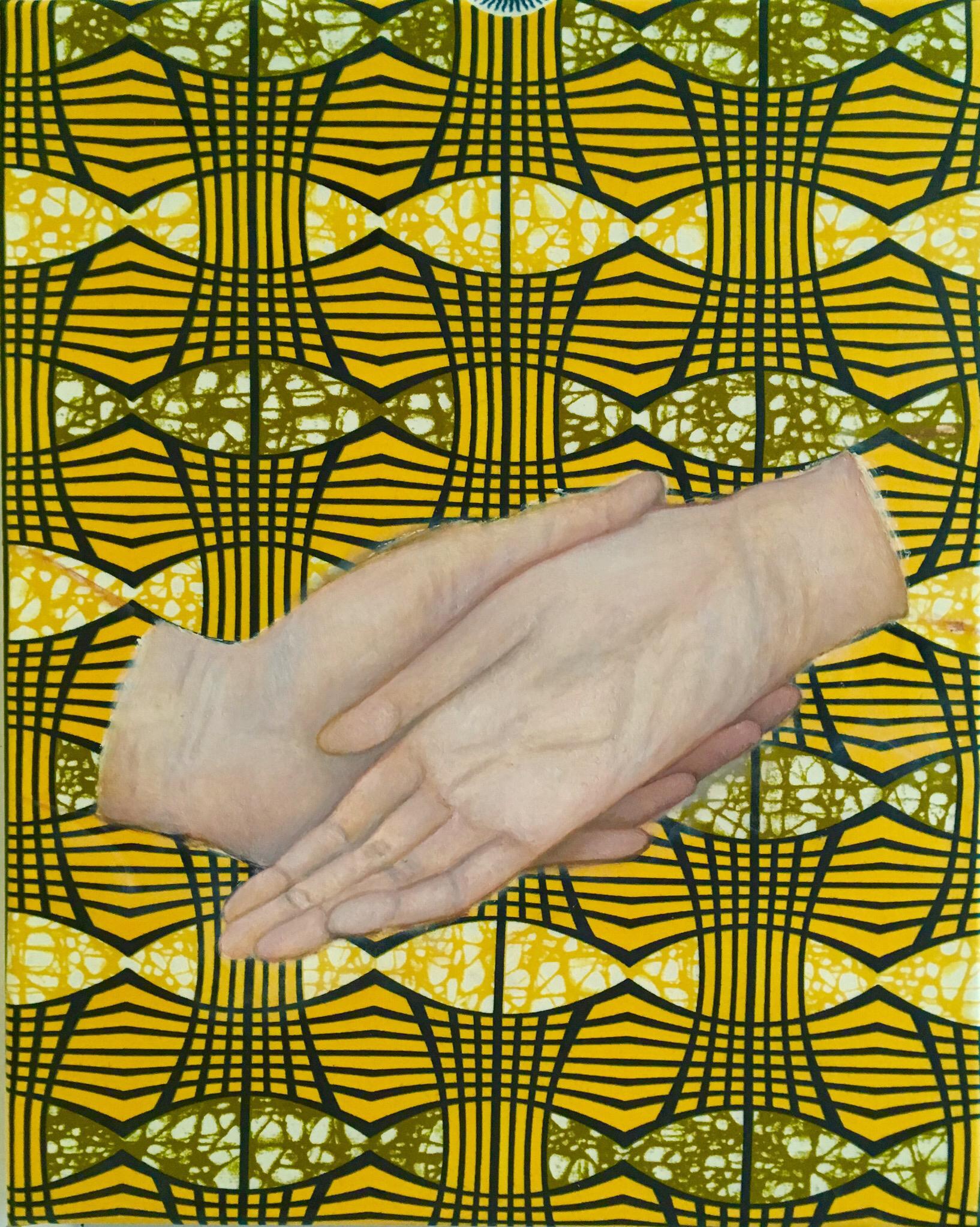 Dans la série Noli me Tangere (« Ne me touche pas Ne me retiens pas », JN, 20,17), la distanciation sociale de ces derniers mois donne naissance à un nouveau paysage de gestes. Les humains se côtoient en respectant des zones d’espaces. Ici, l’ordonnancement des mains est tiré de la peinture, du langage et des précieux symboles de l’histoire de l’art. L’industrialisation a désindividué, et continue de déqualifier les hommes au profit de l’industrie, générant une esthétique standardisée des objets. Cette série sur les mains revient à l’essentiel. Elle évoque l’intelligence des transmissions, des savoirs par les mains (se réapproprier l’étymologie d’artiste, du latin ars, l’art, l’artiste, l’habileté, le savoir-faire, techné τέχνηet chez les Grecs). En laissant une trace de main, une manufacture ouvrière, il s’agit de faire revenir le geste humain sur l’imprimé industriel (des tissus wax africains multicolores). Une tension naît de la superposition du geste manuel sur un tracé mécanique répétitif abstrait. Il faut que le geste ait un sens. Il nous donne une existence et non plus une seule subsistance. Un savoir individuel, une singularité, une personnalité, une empreinte, une signature artistique.