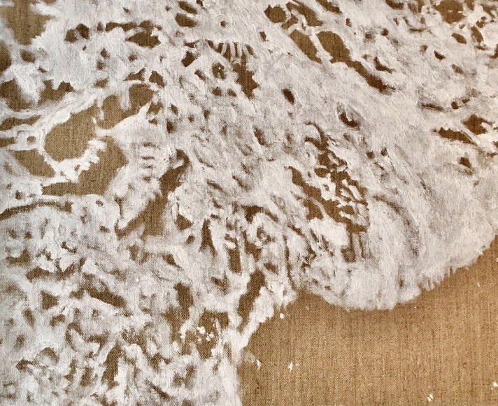 Aphrodite tient son nom du terme grec aphros / ἀφρός qui signifie « mousse ». Hésiode rapporte dans sa Théogonie qu’Aphrodite est née de la mousse blanche produite par les organes génitaux sectionnés d’Uranus, après que son fils Chronos les ait jetés à la mer. Aphrodite était adorée comme déesse de la mer, de la guerre, et surtout de l’amour, de la beauté, de la fertilité et du mariage. Dans la série Aphros / ἀφρός, l’écume fertile fait apparaître une toile nue évoquant le sable.