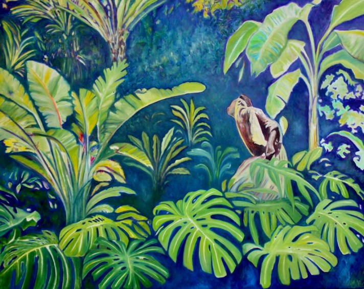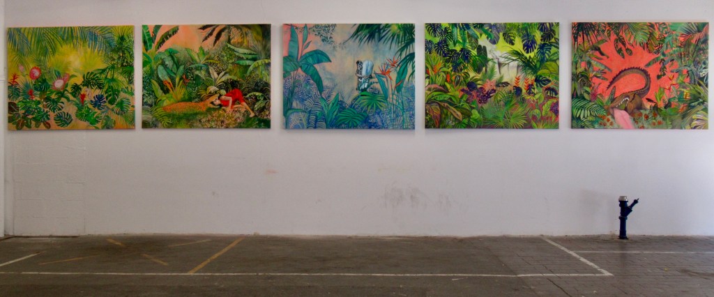 Cet impact se manifeste par des teintes pétrochimiques fluorescentes toxiques, contrastant avec des espaces sauvages indomptables : jungles luxuriantes, sorte d’hybris ancestral paradisiaque, fruit de rêveries et d’extrapolations. Les couleurs acidulées des gaz toxiques envahissent les tropiques du jardin des délices. Fruit de la terre surconsommé. Un sublime qui a subi le passage du naturel à l’artificiel, inscrit dans des paysages qui laissent entrevoir, par la présence des plantes, leur réelle vocation naturelle. Les scènes évoquent un univers végétal foisonnant où l’air, les personnages, et les animaux, affichent l’expérience d’une profonde dégradation environnementale. Cette ère d’incertitude, cet âge géologique échappe par sa nature aux échelles spatiales et temporelles de l’humain, et subséquemment à nos capacités d’appréhension.