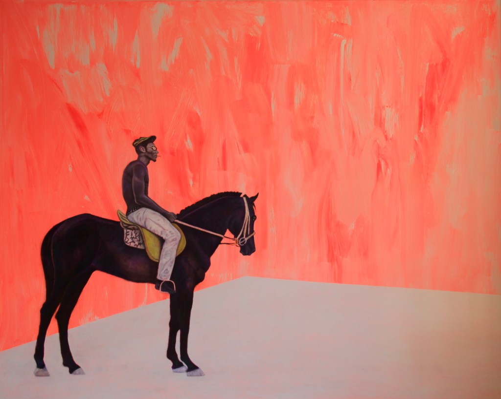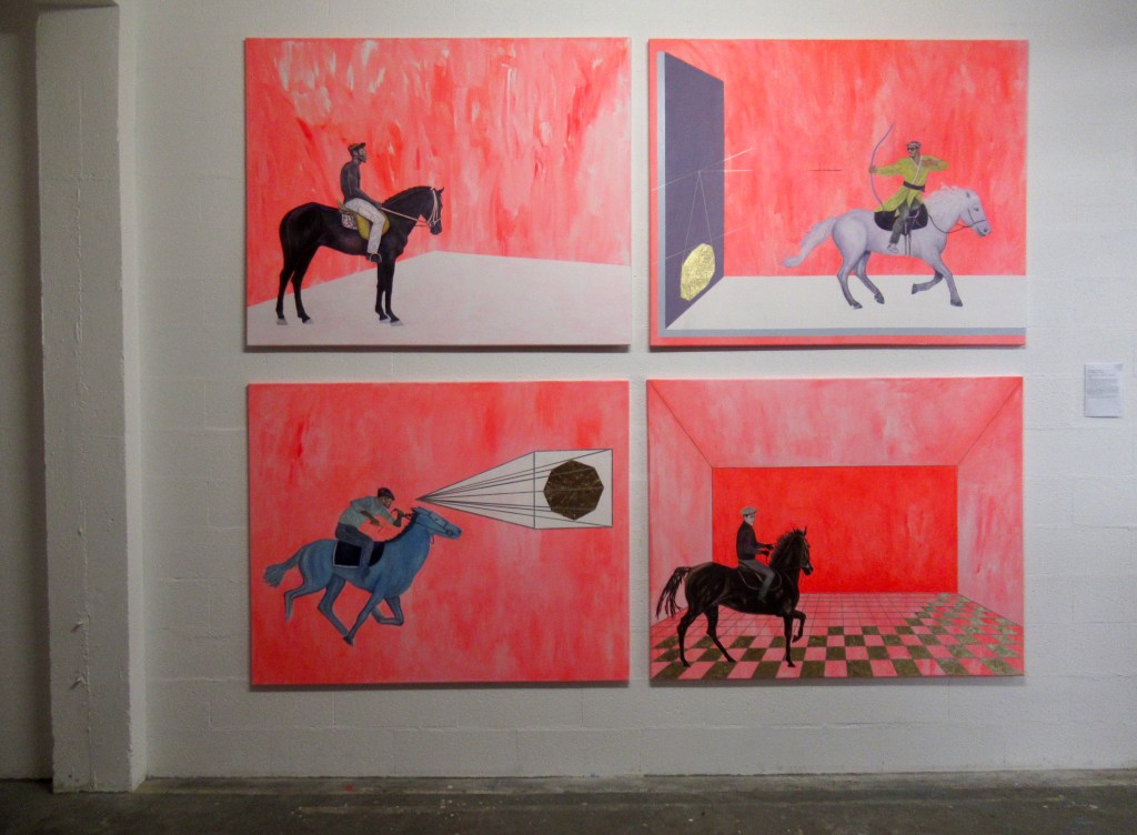 couleurs et des gestes, vifs et simples. Les cavaliers avancent dans des espaces d’expositions, la plupart d’entre eux avance les yeux couverts, ils dominent leur monture et pensent parfois dominer le monde. Spectateurs, regardeurs ou aveugles plongés dans des espaces transformés par des formes d’anamorphose. Ils cherchent des perspectives d’avenir. Serait-ce les chevaux enflammés de Malaparte qui se jetèrent dans l’eau glacée du lac Lagoda en Russie, ou leur évocation en chevaux taxidermisés, alignés « kaputt», têtes plantées dans le mur comme pour ne pas voir le monde réel, chez Maurizio Catelan. La construction en perspective, la couleur modifie la perception de l’espace et les sujets déambulent dans différents espaces, aussi identiques que différents.